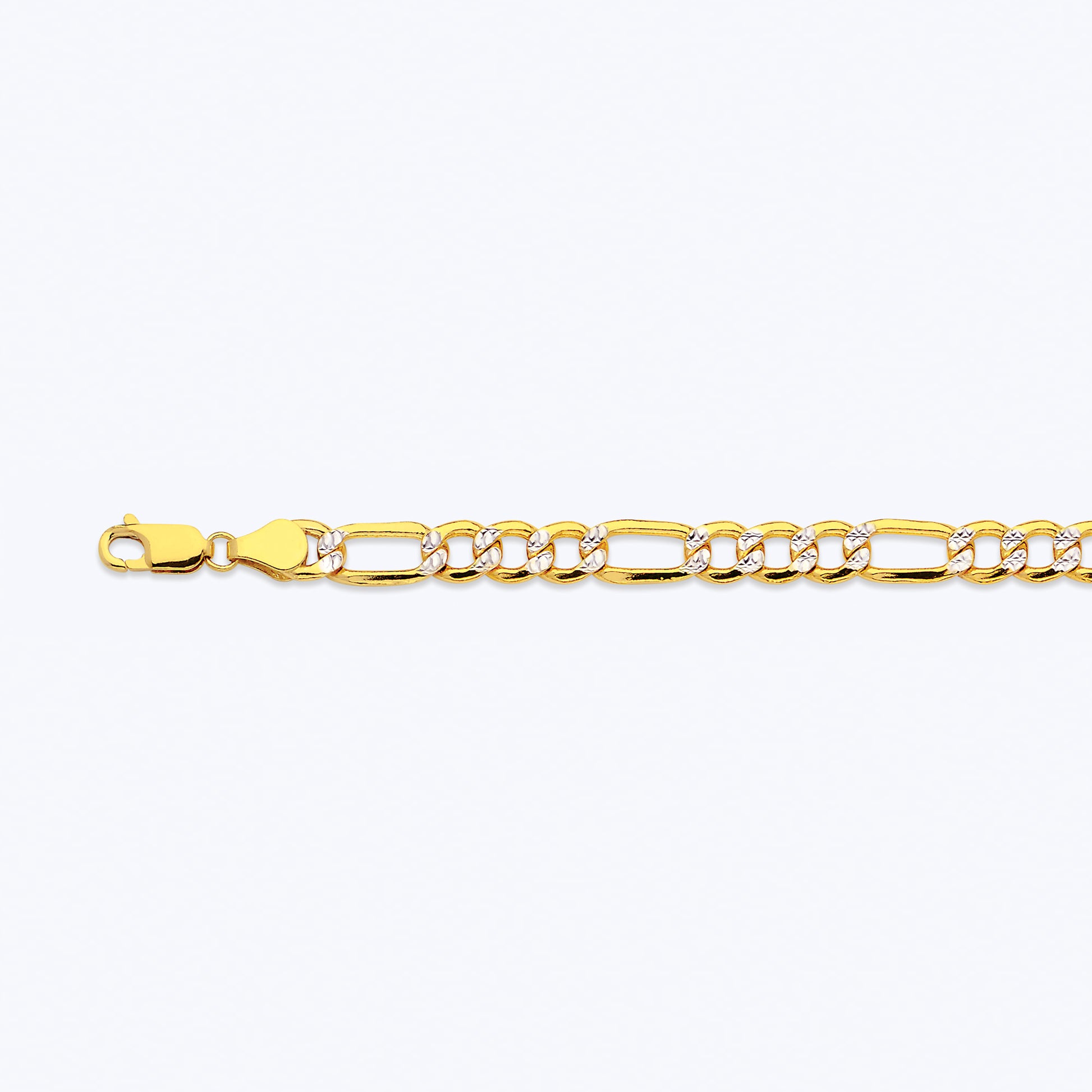 This 10 Karat Yellow Gold Hollow Pave Figaro Chain is a beloved classic worldwide. Made from authentic 10k yellow and white gold, it features two to three small circular links that connect to a long oval link, giving the chain a unique appearance. The center of the curb links is adorned with pave detailing that adds sophistication and elegance to your style. The chain comes in various lengths to suit your preference and weighs approximately 0.53 grams per inch.
